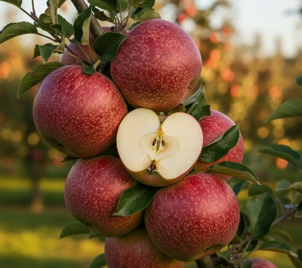 ✔️ Owoce duże, ordzawione, z intensywnym czerwonym rumieńcem.
