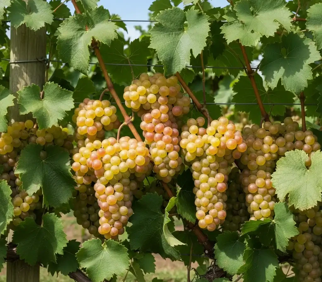 ➡️ Duże, kuliste jagody jasnożółte z różowym rumieńcem – deserowe i do lekkich win